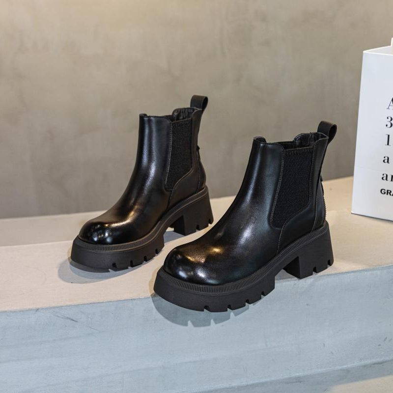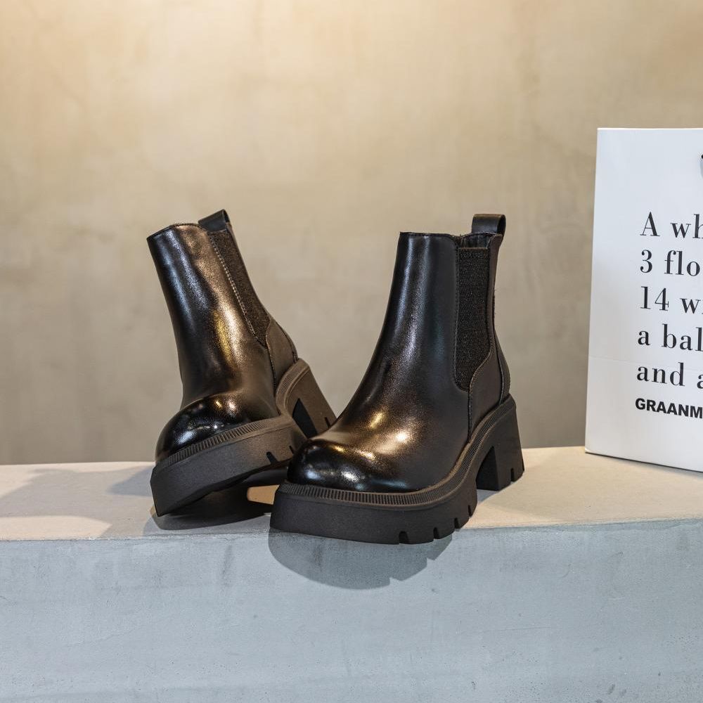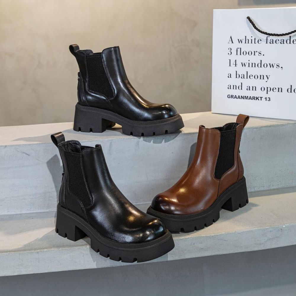 Women's Cowhide Chelsea Smoke Pipe Round Head Thick Boots