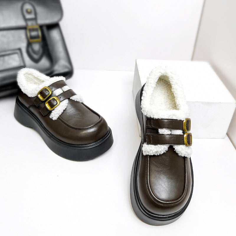 Women's Foot Beauty Power Fleece-lined Round Head Leather Shoes