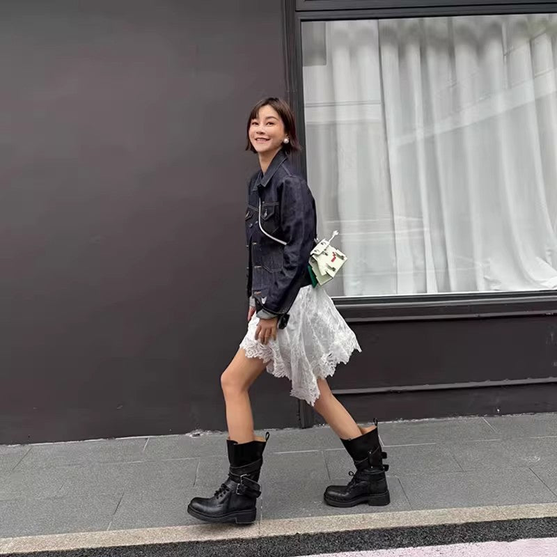 Women's High Motorcycle Knight Chunky Buckle Distressed Western Boots