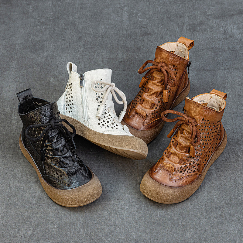 Women's Layer Cowhide Hollow Flat Soft Bottom Boots