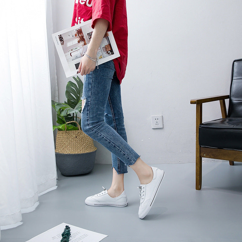 Women's Springtide Korean Style White Cowhide Board Flat Sneakers