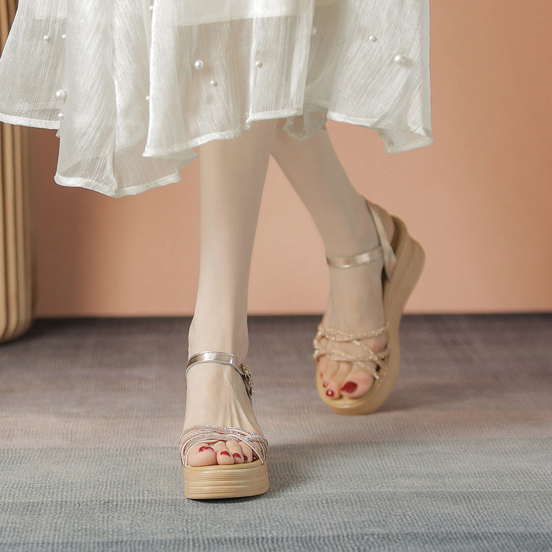 Women's Thin Strap Rhinestone Wedge Korean Platform Sandals